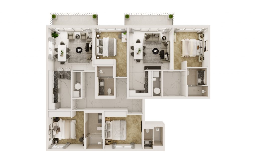 Four Bedroom Deluxe Apartment consisting of four Super-King bedrooms, 4 bathrooms, a fully-equipped kitchen with appliances, a spacious living/dining area with sofa bed and a balcony.