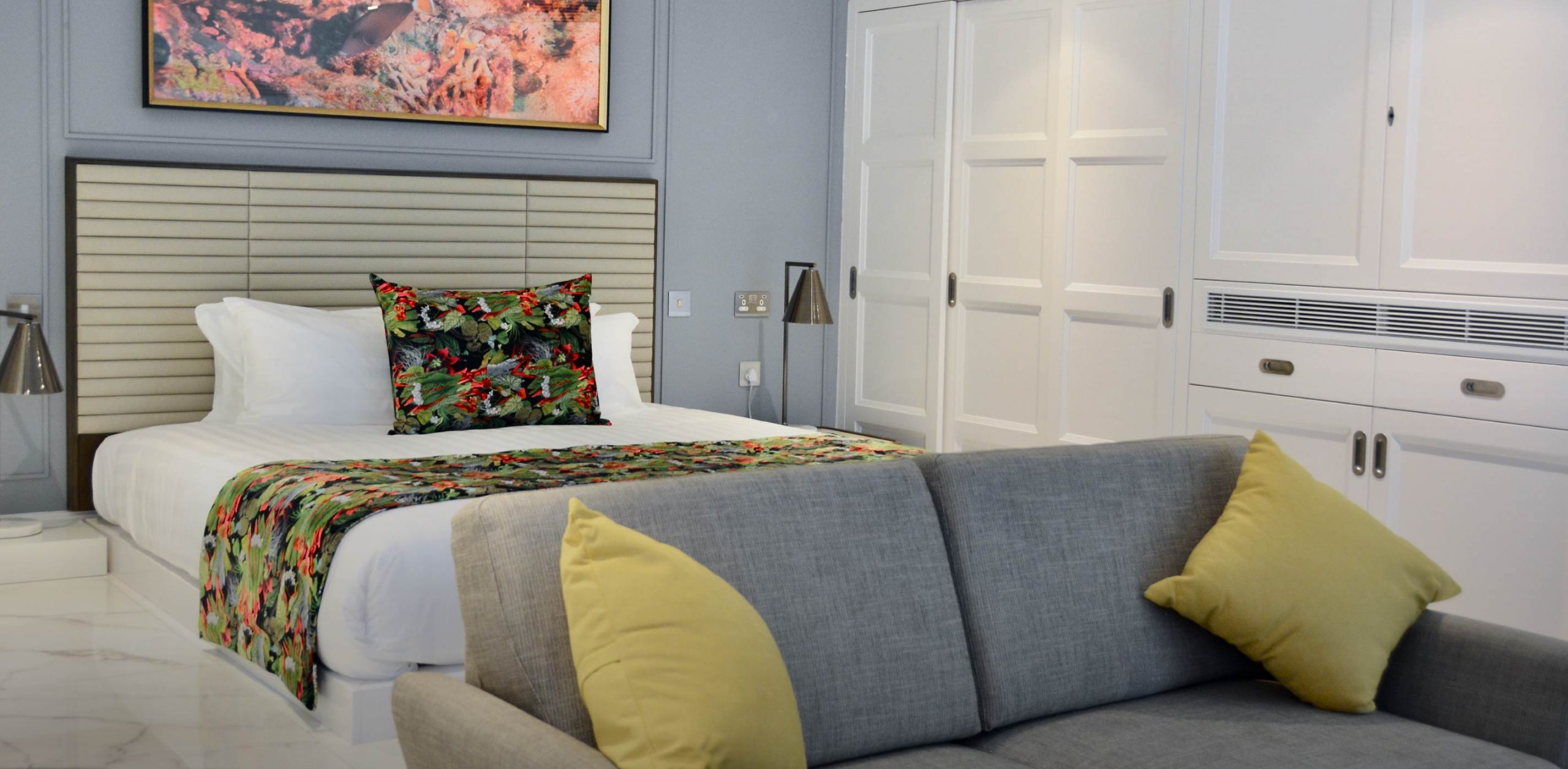 Studio Deluxe Apartment consisting of one Super-King bed, one bathroom with a walk-in shower, a fully-equipped kitchen with appliances, a spacious living/dining area with sofa bed and a patio.